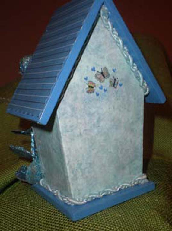 I love the color blue. It is so calming and alluring all at the same time. This home has something on every corner. The roof is striped and rick-racked on the edges and the bird hole is a blue heart. An eye-catching glittered blue tree is in the front with an acrylic light blue bird that is watching you. The walls are a muted haze of blue and a light blue cord adorns the edges. On the back I stamped 3 butterflies and 7 blue hearts. As I said earlier, something to look at on the whole house!