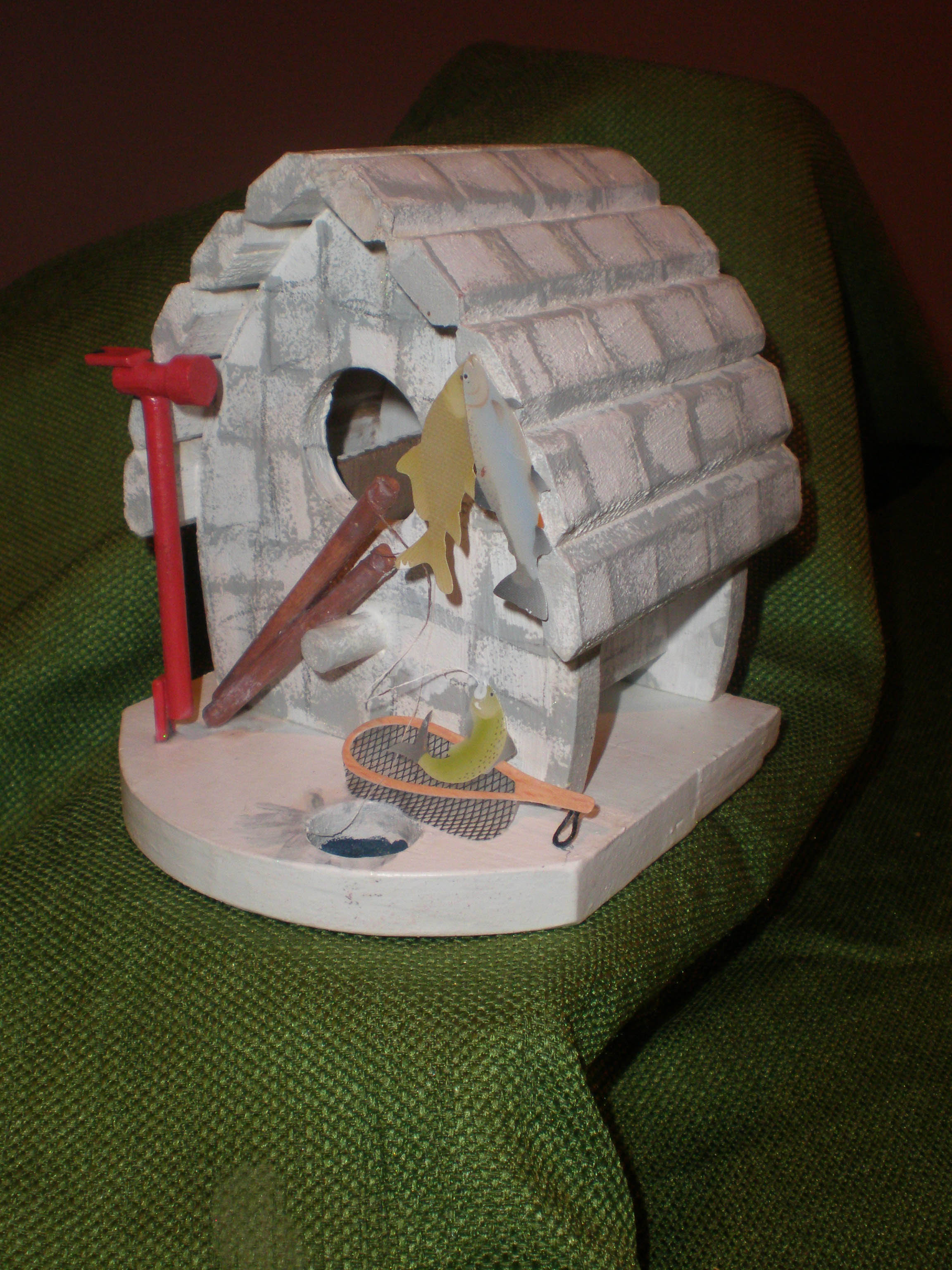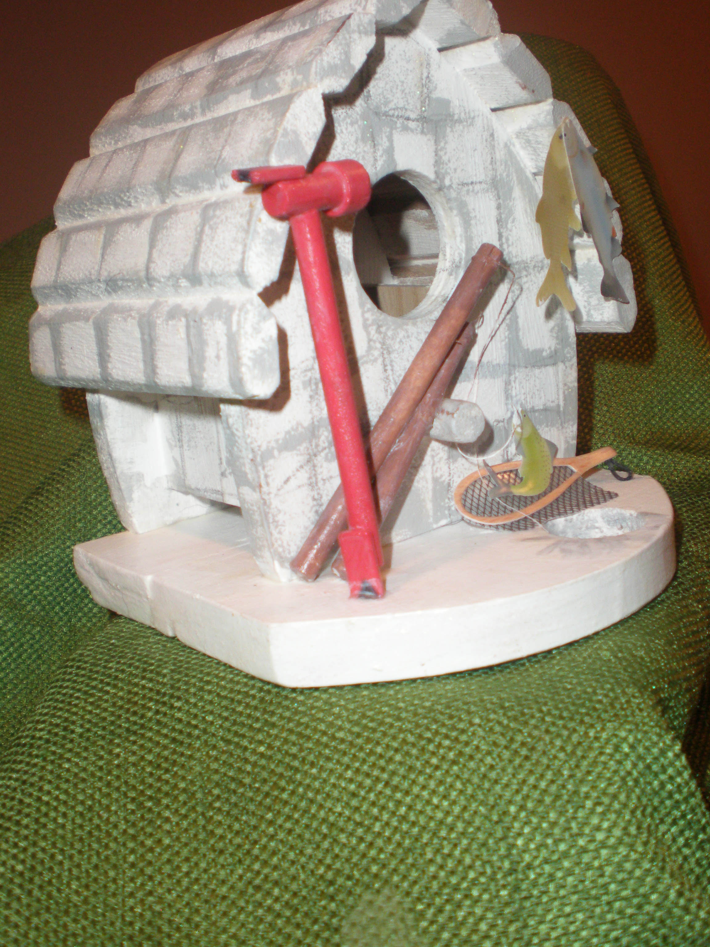 All the gear is displayed to go ice fishing. Doesn't it call to you my Eskimo friends! All that's missing is the bird that has taken the time to set all this up; maybe they are resting inside the birdhouse.They have caught a couple fish and it looks like a good day for fishing. Wish them luck!