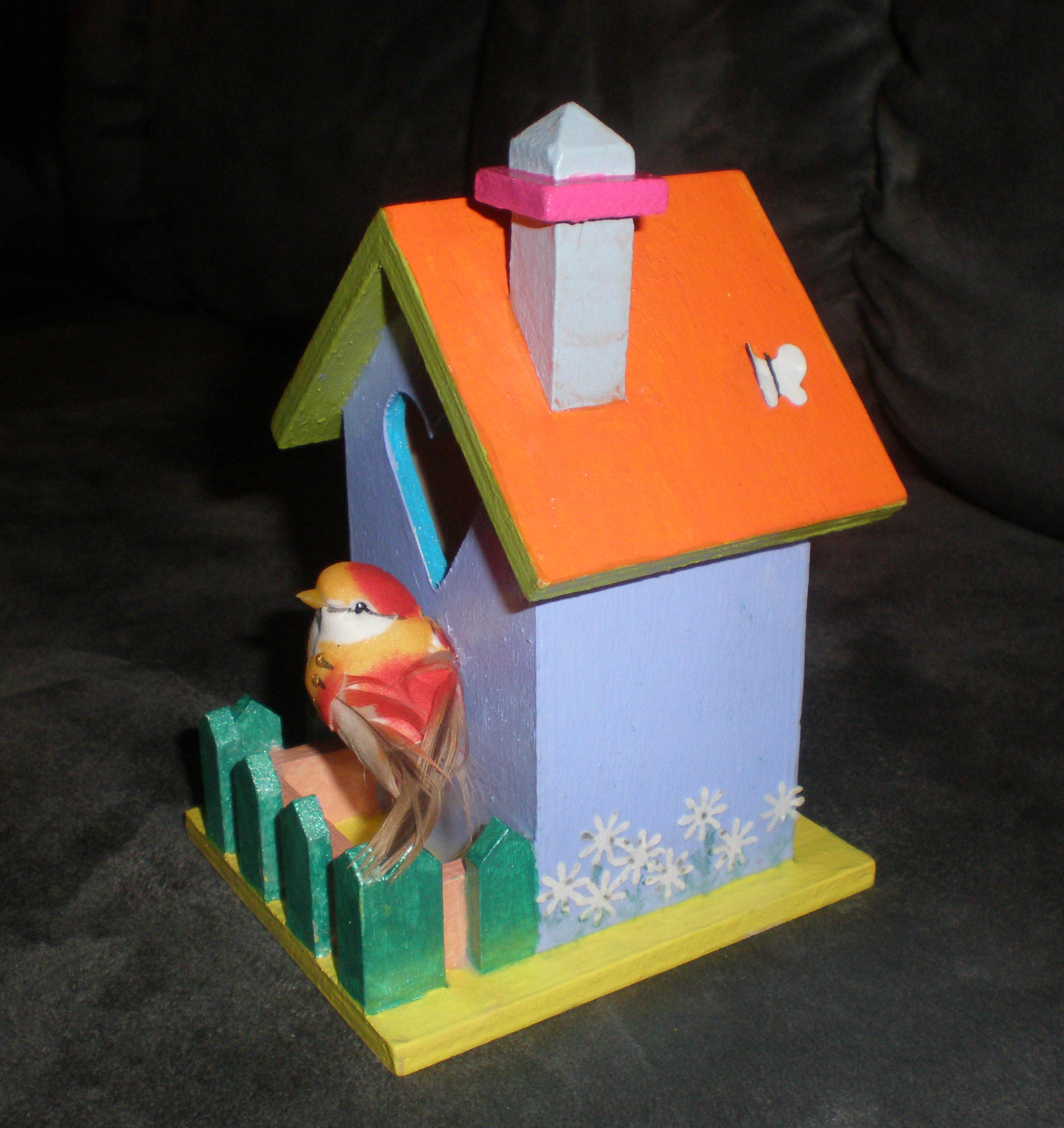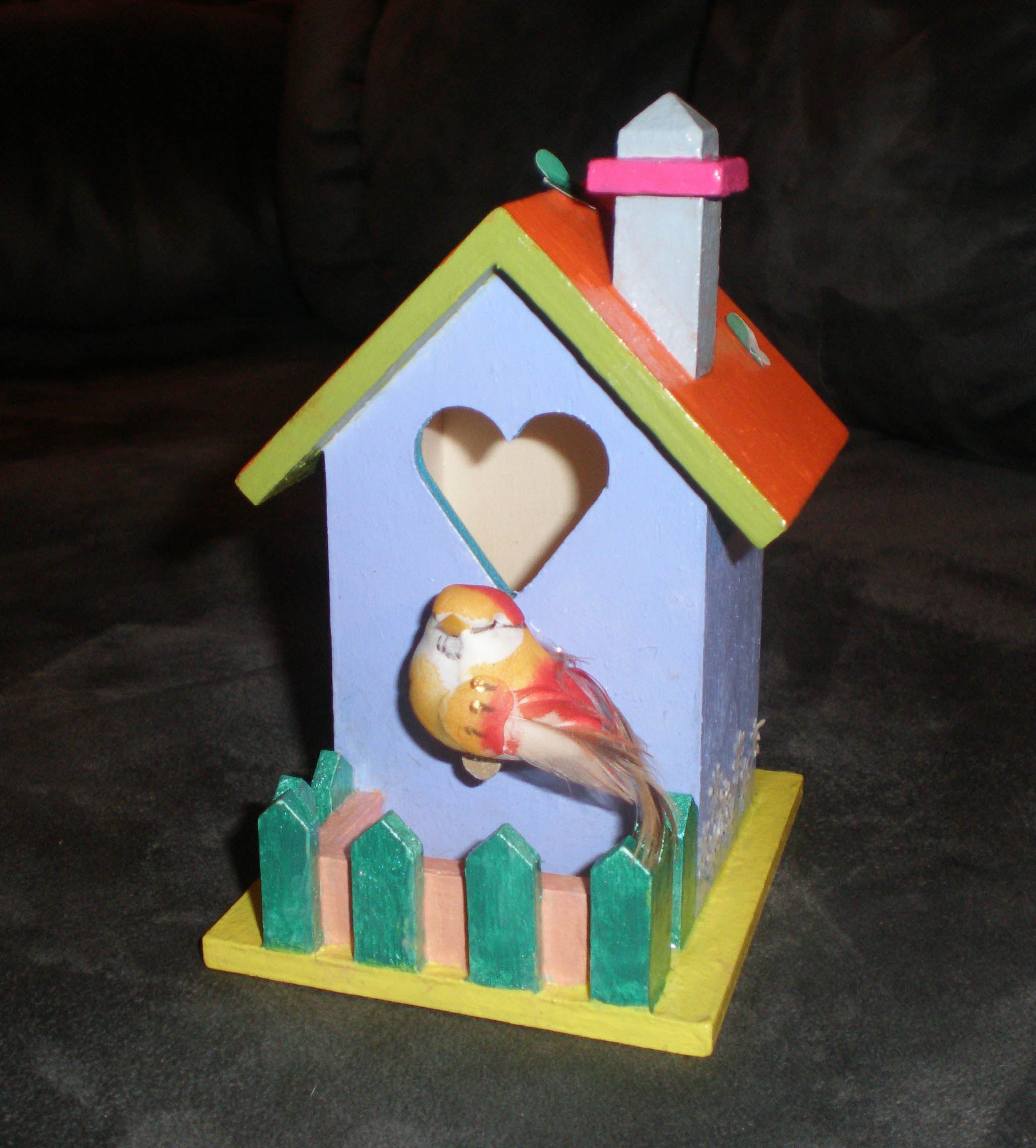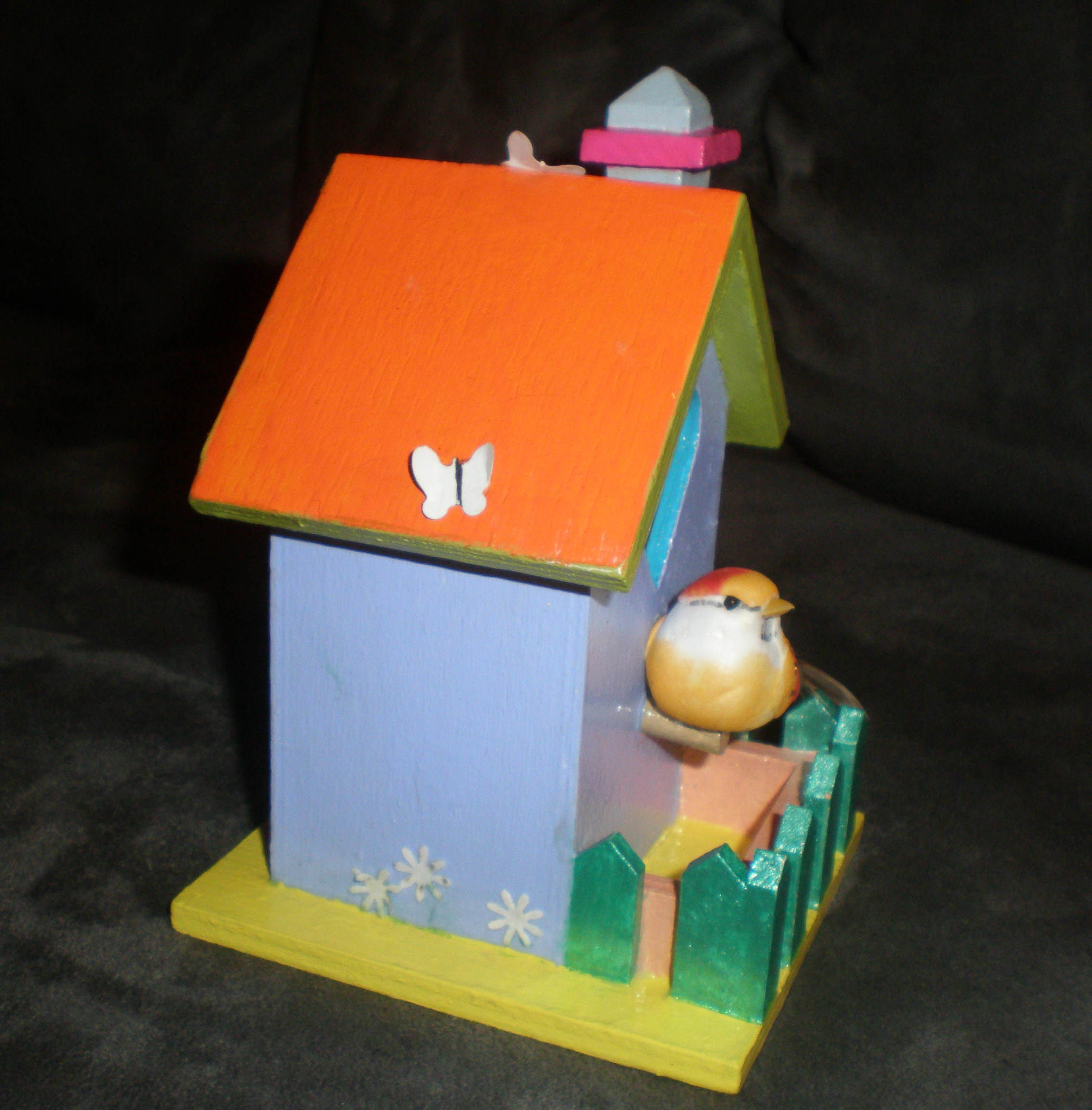 A colorful birdhouse with a fence and feeding area for the lucky bird that lands here. Wait! It looks like a bird has found it already.