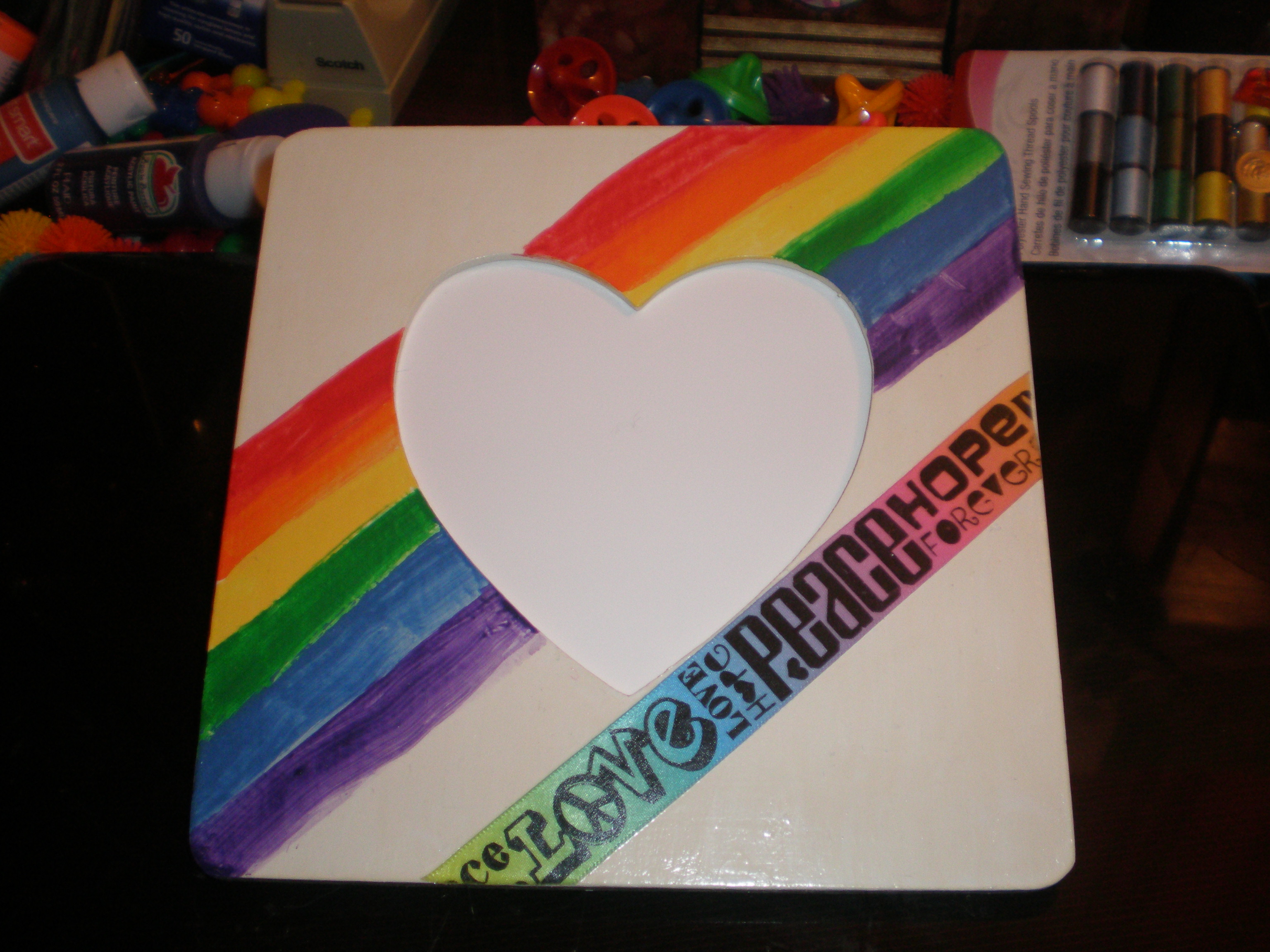June is almost upon us and so is Gay Pride month. Support your friends and family by showing you care by displaying this heart frame or purchase it as a gift. Primed wood starts off this 8 X 8 frame, then the paint and ribbon and finally two coats of satin varnish for long lasting durability. The ribbon is so friendly and it says: love, peace, hope, and forever. Show your support this coming June!