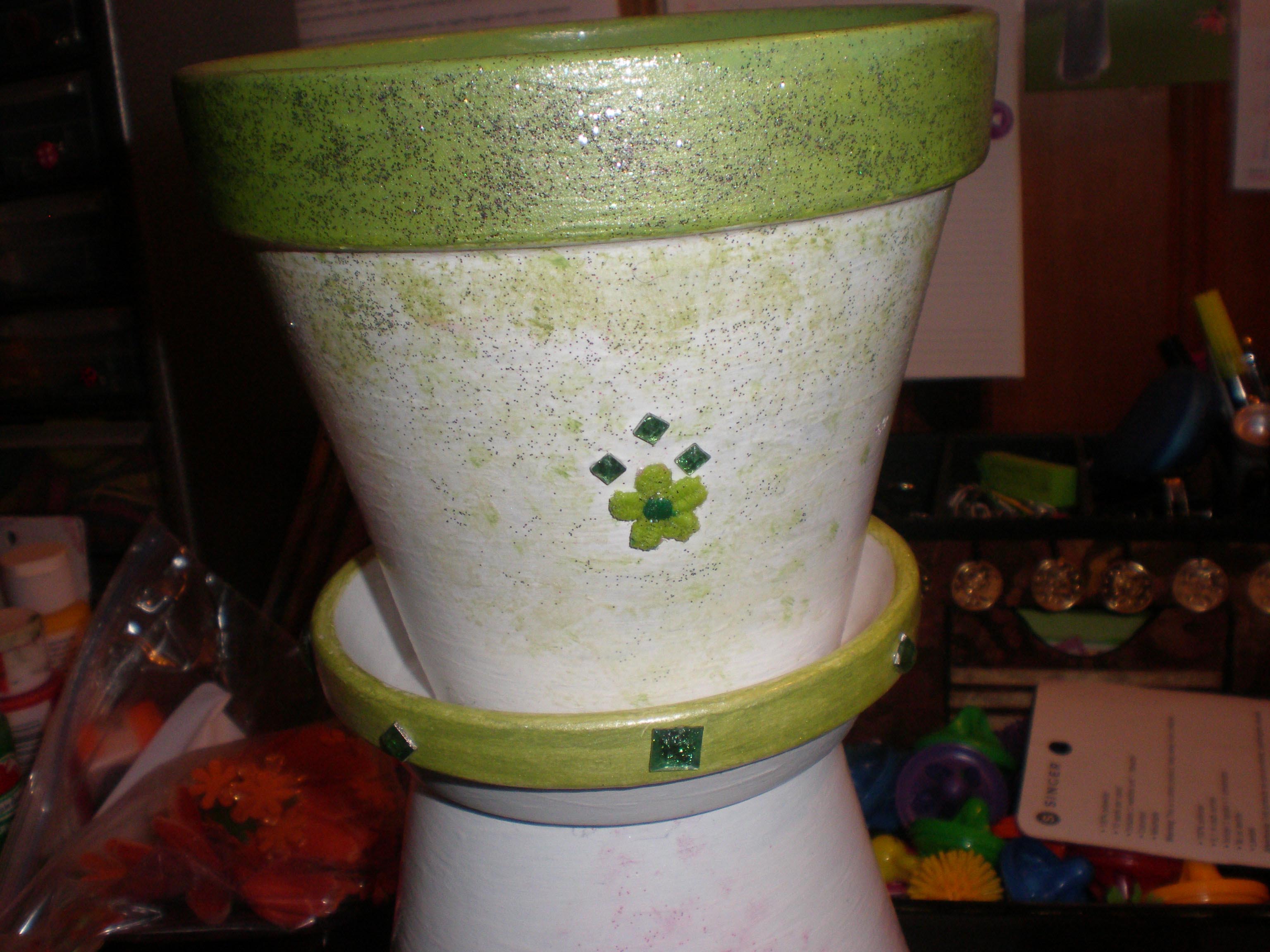 Cute flower Pot with a small flower applique and rhinestone accents on the pot and around the saucer. Great housewarming gift with a plant inside. Glitter was added to the paint and then varnished for long-lasting protection.