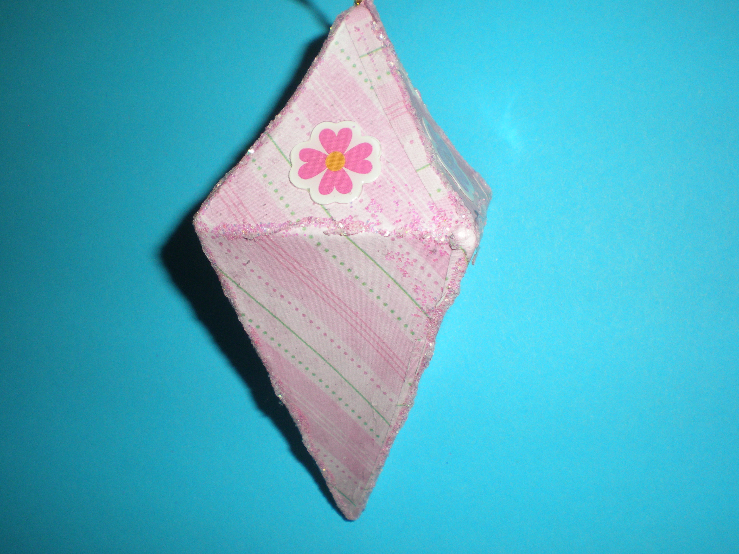 A soft pink striped ornament with glitter all along each edge to help accentuate the flowers. I great window decoration.
