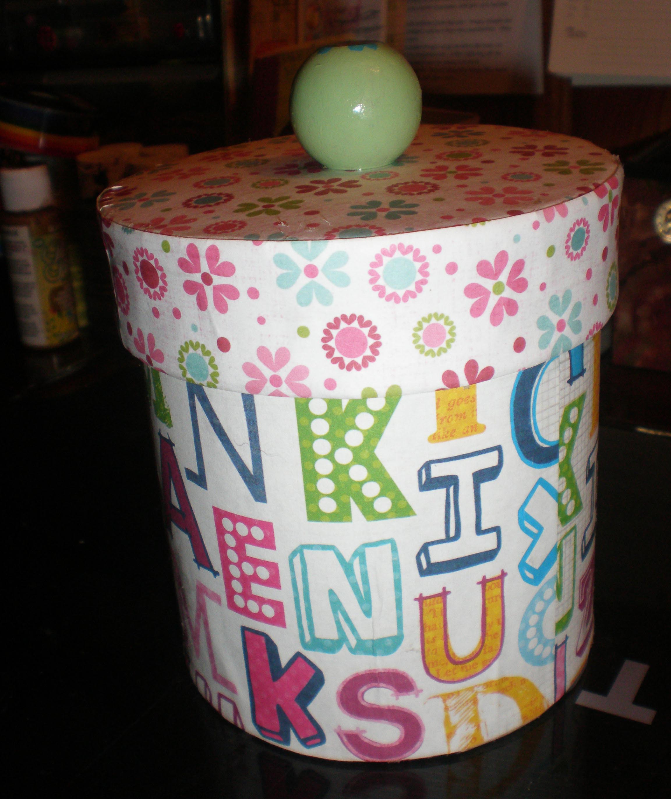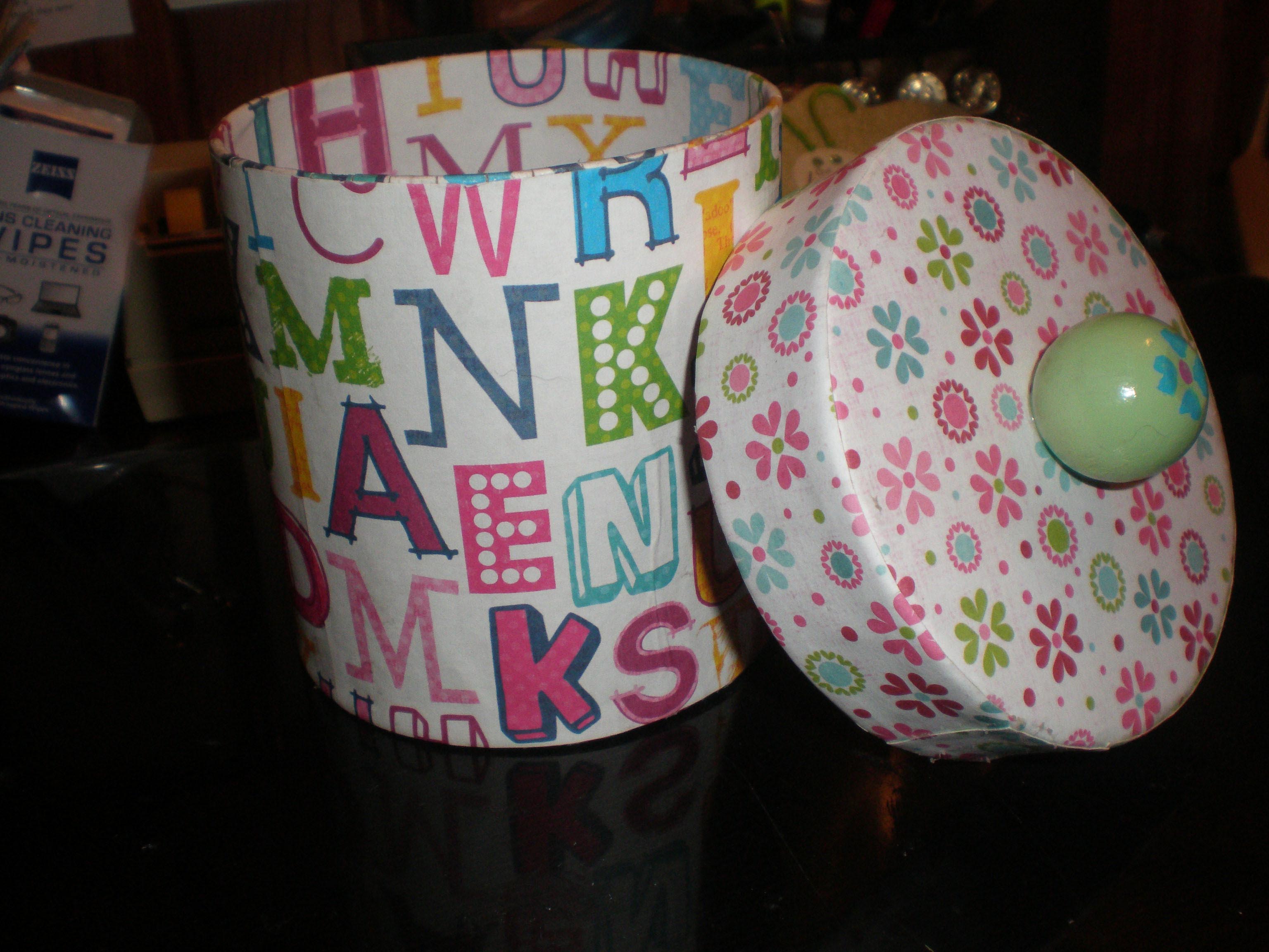 A cute addition to your home office, bedroom or use as a home decoration, Made with heavy duty scrapbooking paper and the knob on the lid is securely attached with E-6000 glue. Not to be used in or around water.