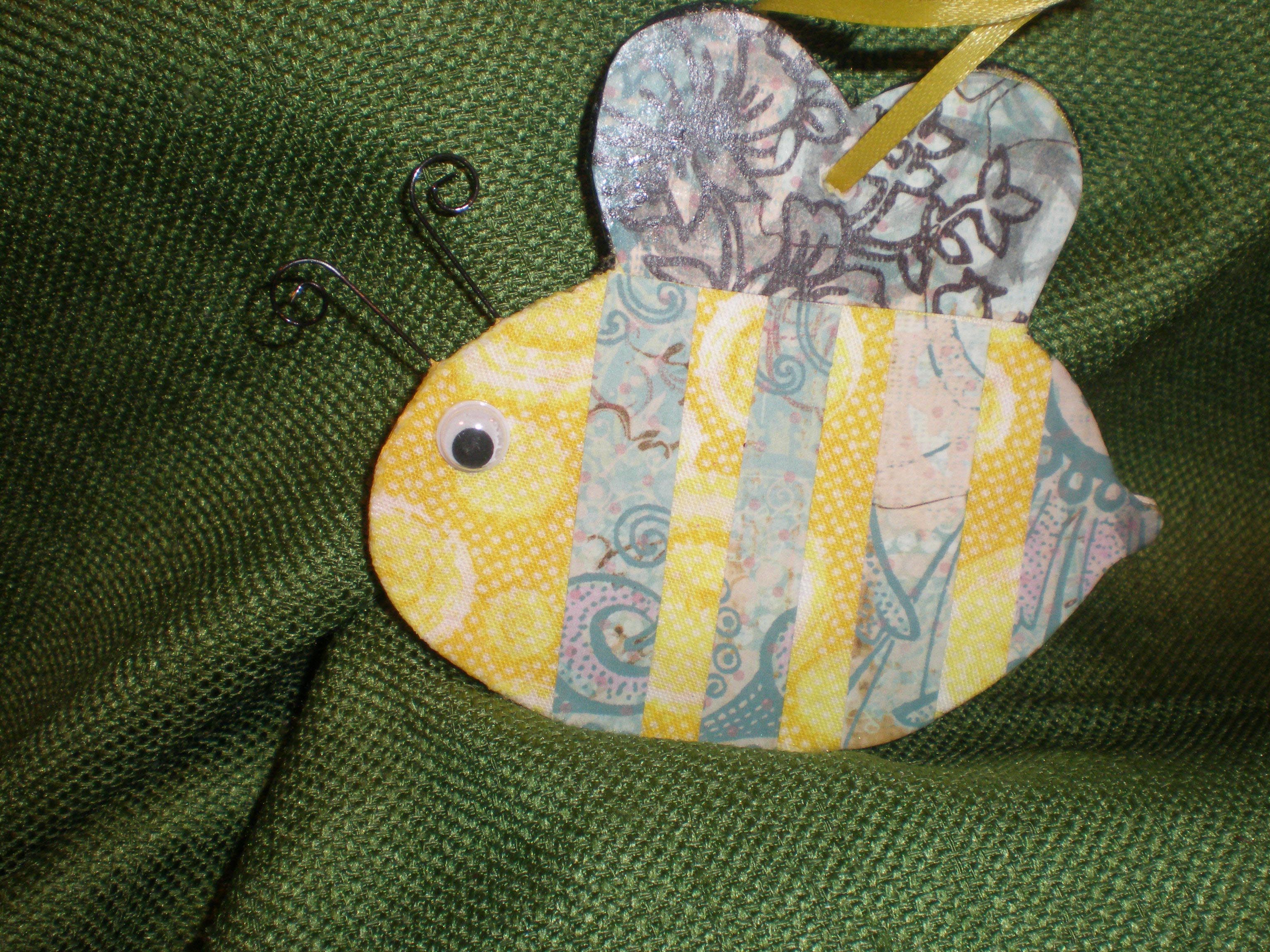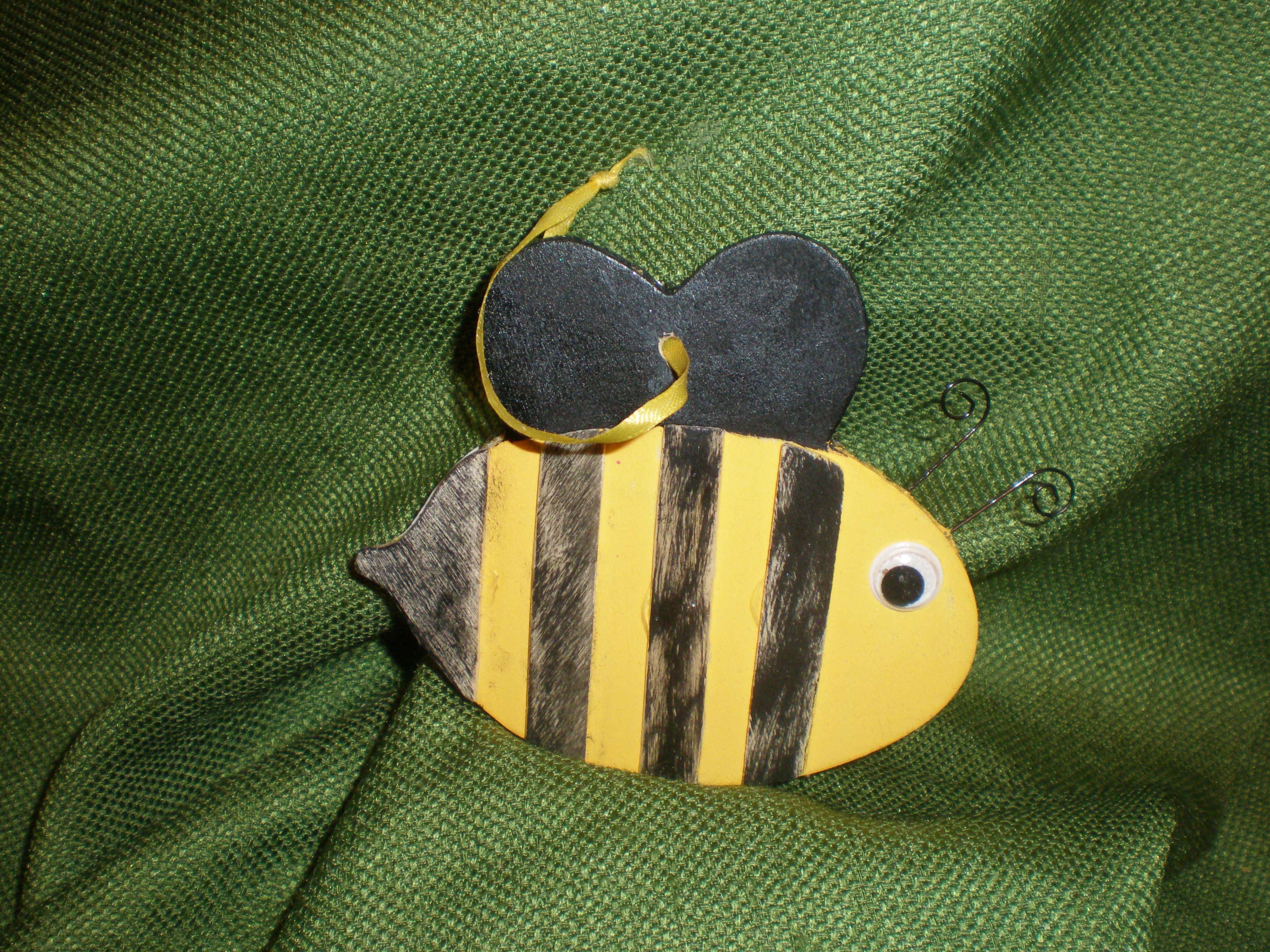 An ordinary Yellow and black bee on one side and on the side is a bee camouflaged by bushes and the sun. You really can only see him because his eye.