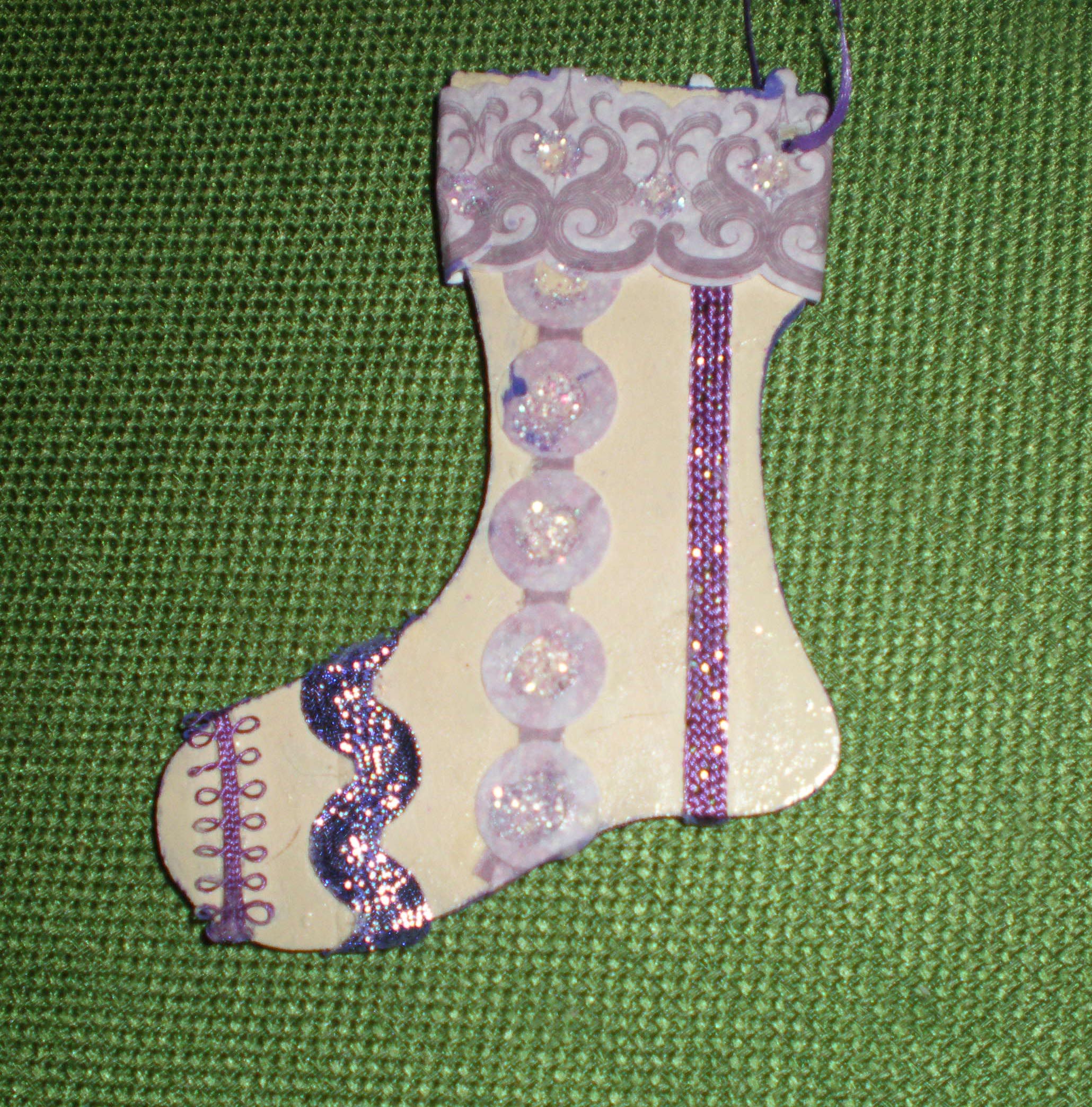 4"h X 3"w With different stripes of glittering ribbon and fanciful paper this stocking looks like it belongs in the Victorian era.