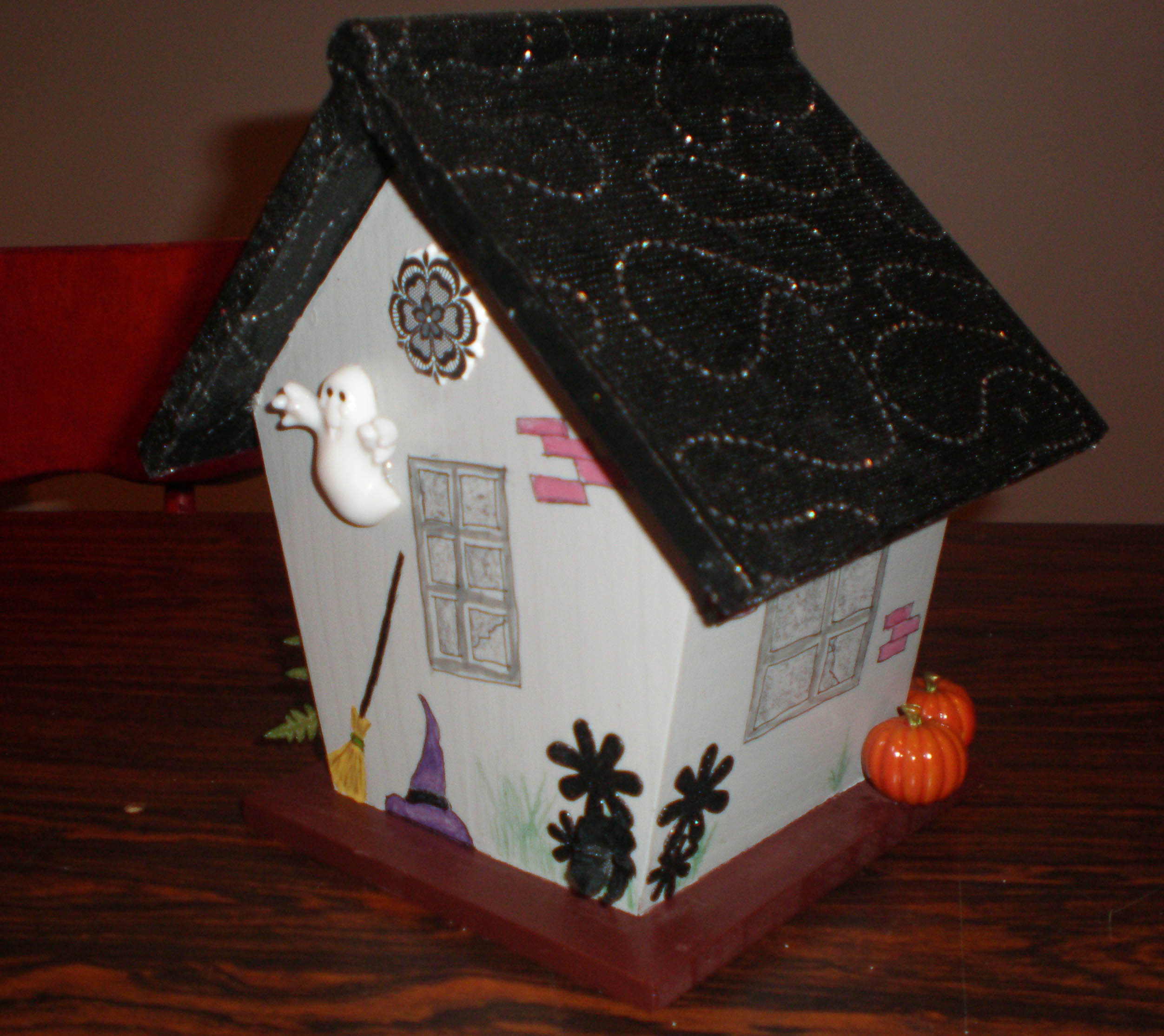 A gentle haunted Halloween Cabin. I tried to include the feel of harvest and Halloween together in this adorable birdhouse. Included are a witches broom, a witches hat, black glittered flowers and 1 black silk flower, 2 #D ghosts, a scared black cat, a silk tree, 2 pumpkins, tulle covered roof with silver swirls running through it, and a black spider hanging down to come and greet you.
