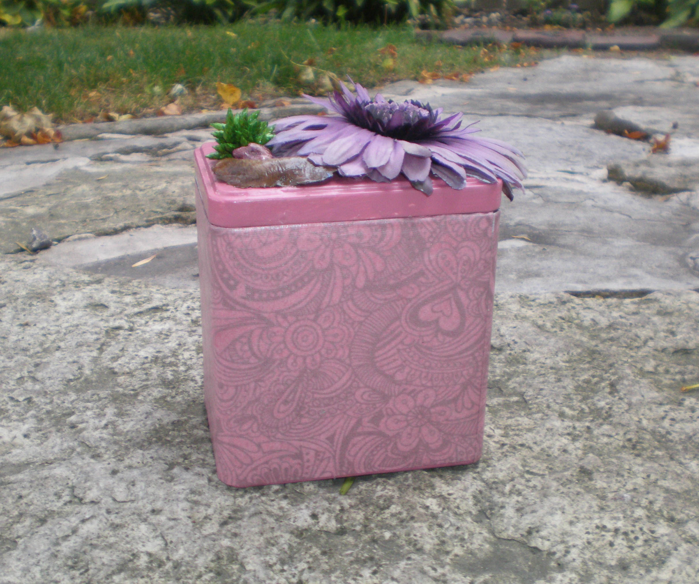 For all those purple or pink lovers a tin can to store odds and ends, jewelry, or whatever. A great piece for any room of the house, especially the bedroom. Enjoy!